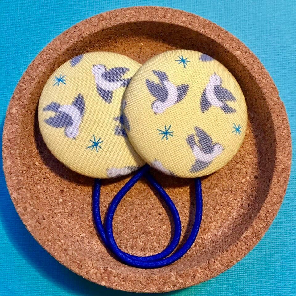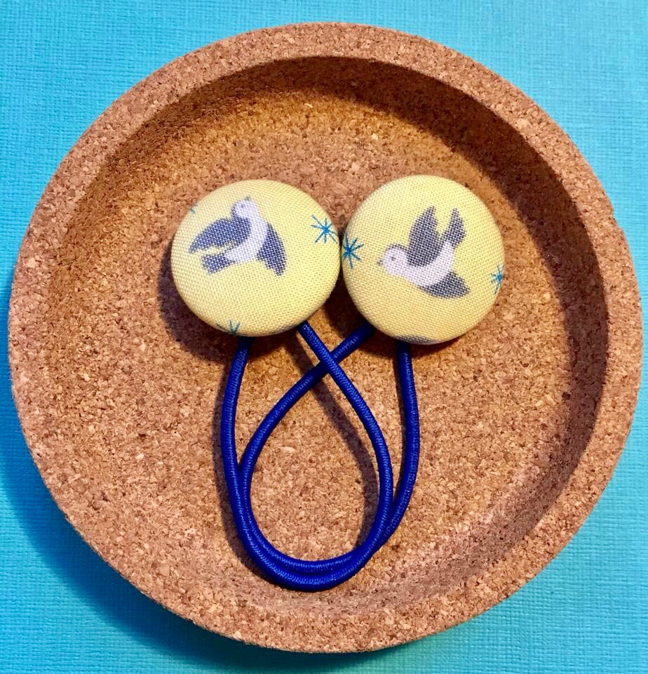 Little bluebirds mid flight on a yellow background. They remind us of Snow White’s birds.