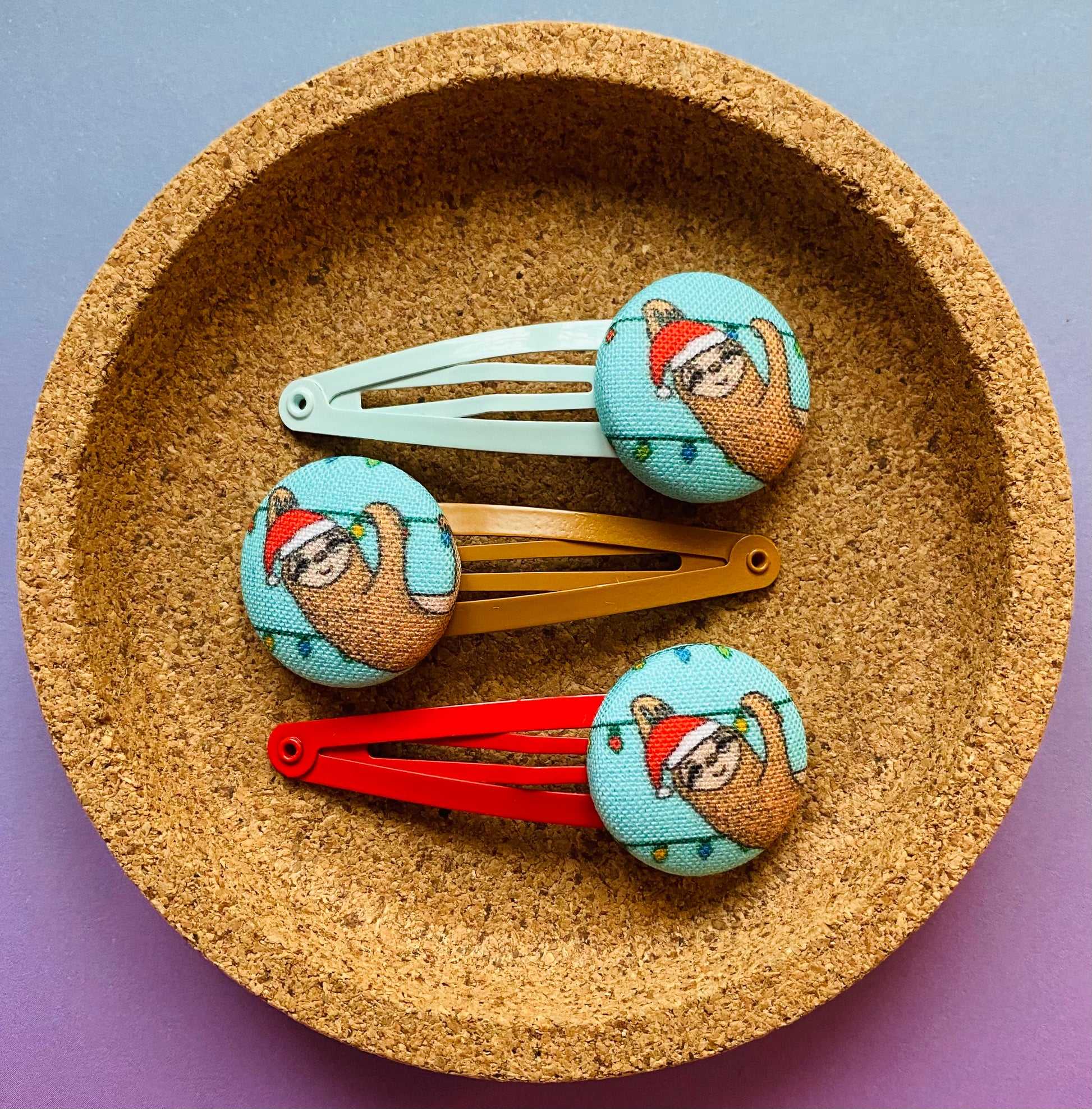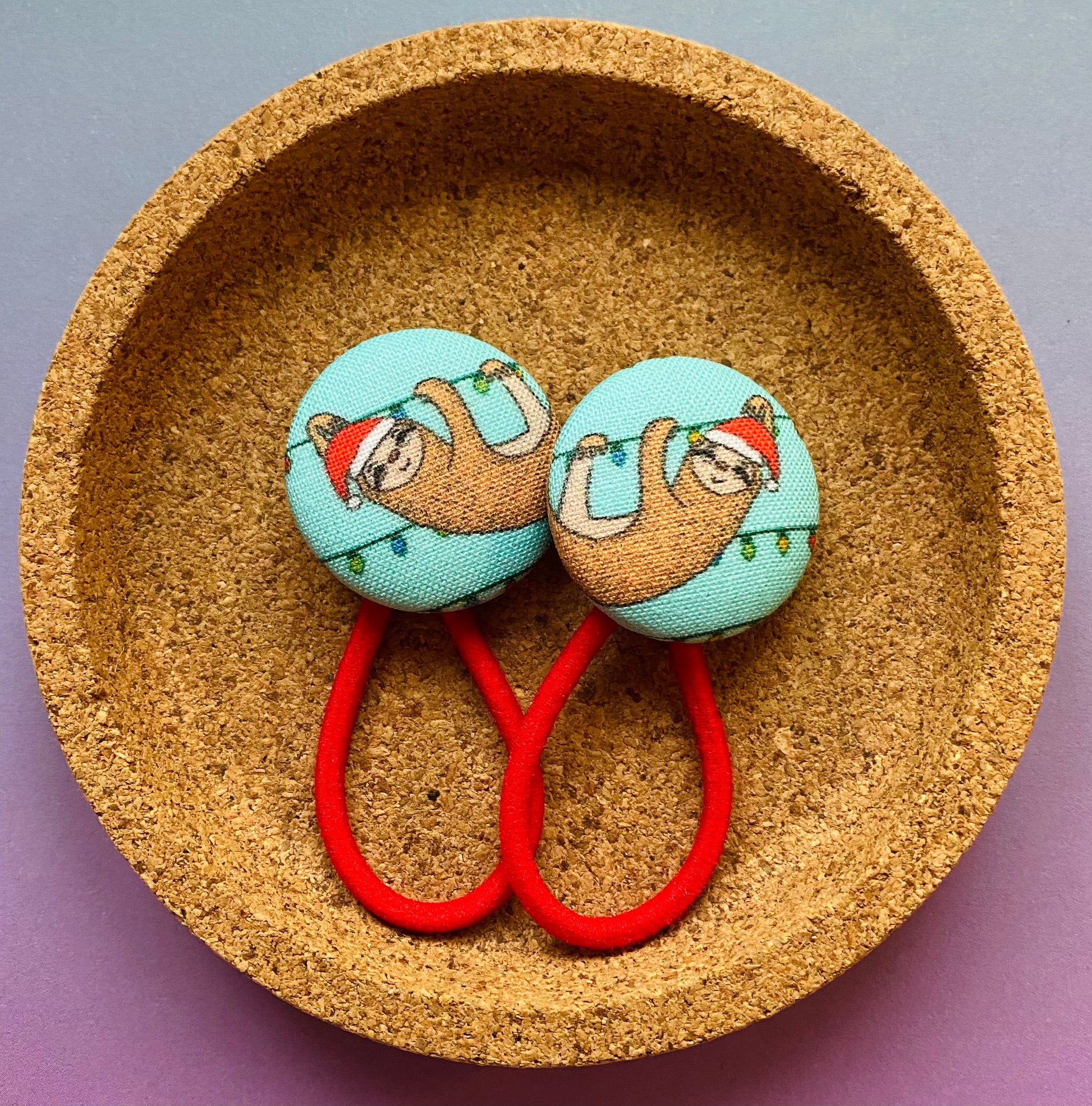 Little sloths hanging on Christmas lights and wearing Santa hats, on a turquoise blue background. They work well in Small & Tiny Bobbles, Standard & Tiny Clips.