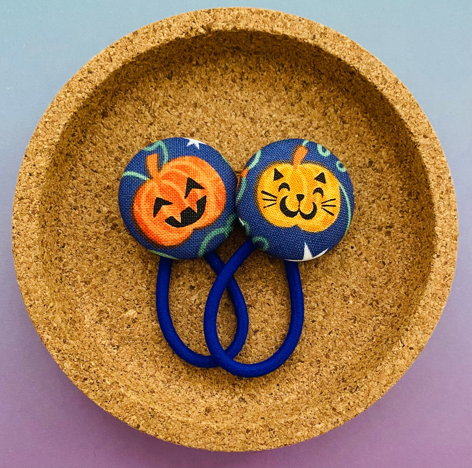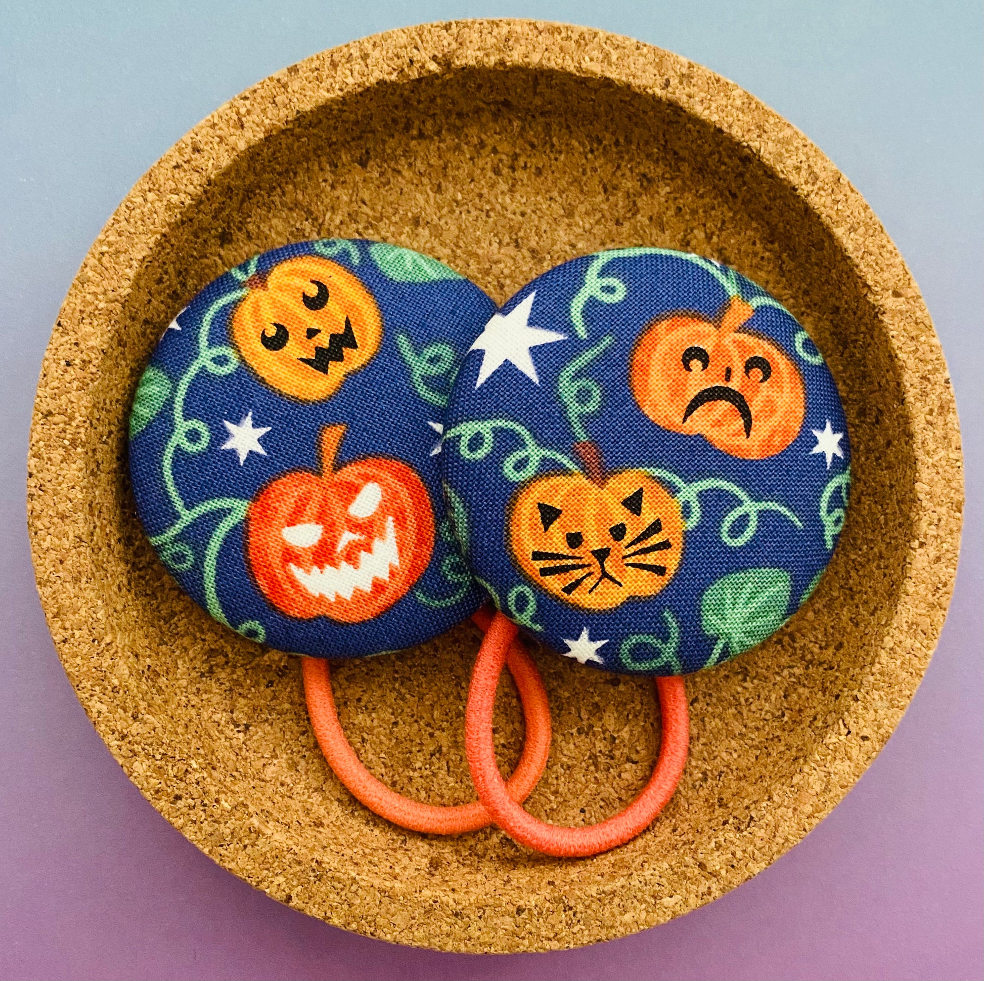 That’s right, they glow in the dark! Little pumpkins and stars on a purple/blue background.