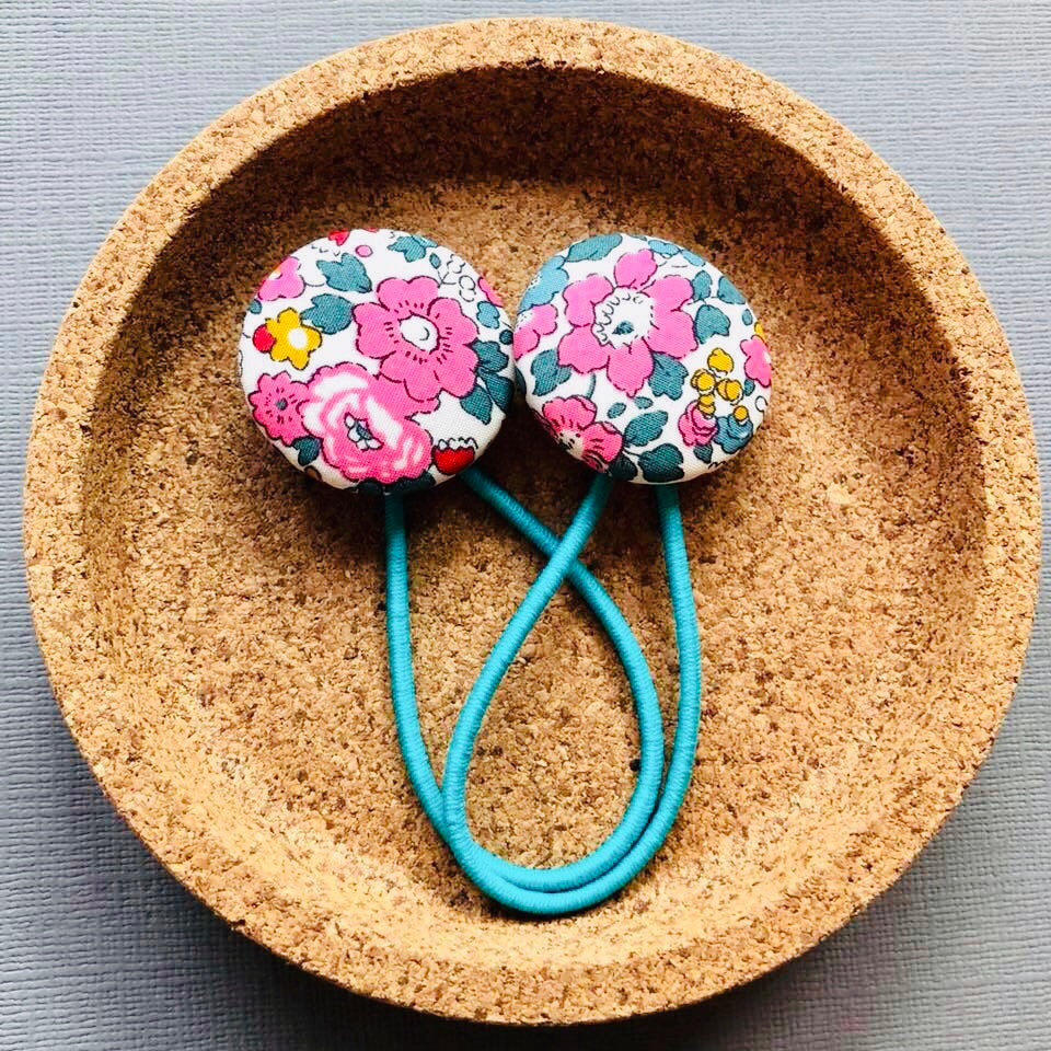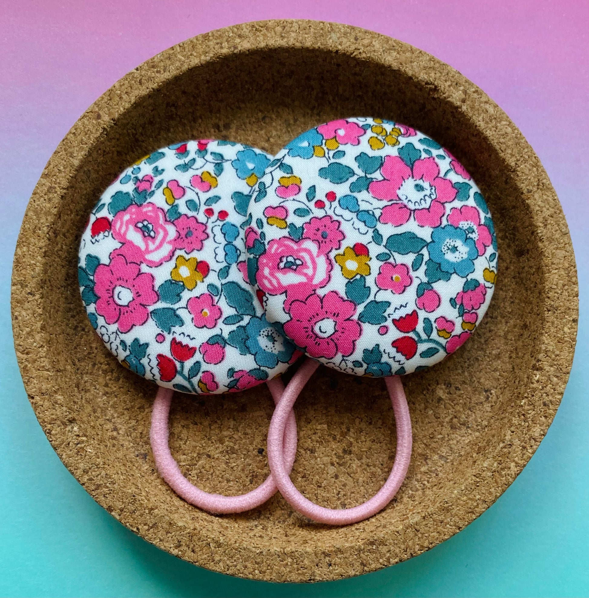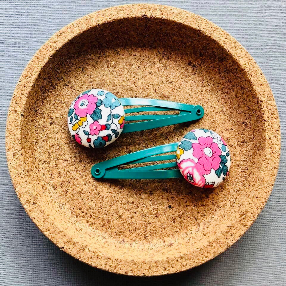 Beautiful classic Liberty Betsy-Ann, one of our favourites here at Monty & Mabel. With teals and pinks as the main colours, they work well in Large & Small Bobbles, Standard & Tiny Clips, and Small, Medium, Classic & French bows