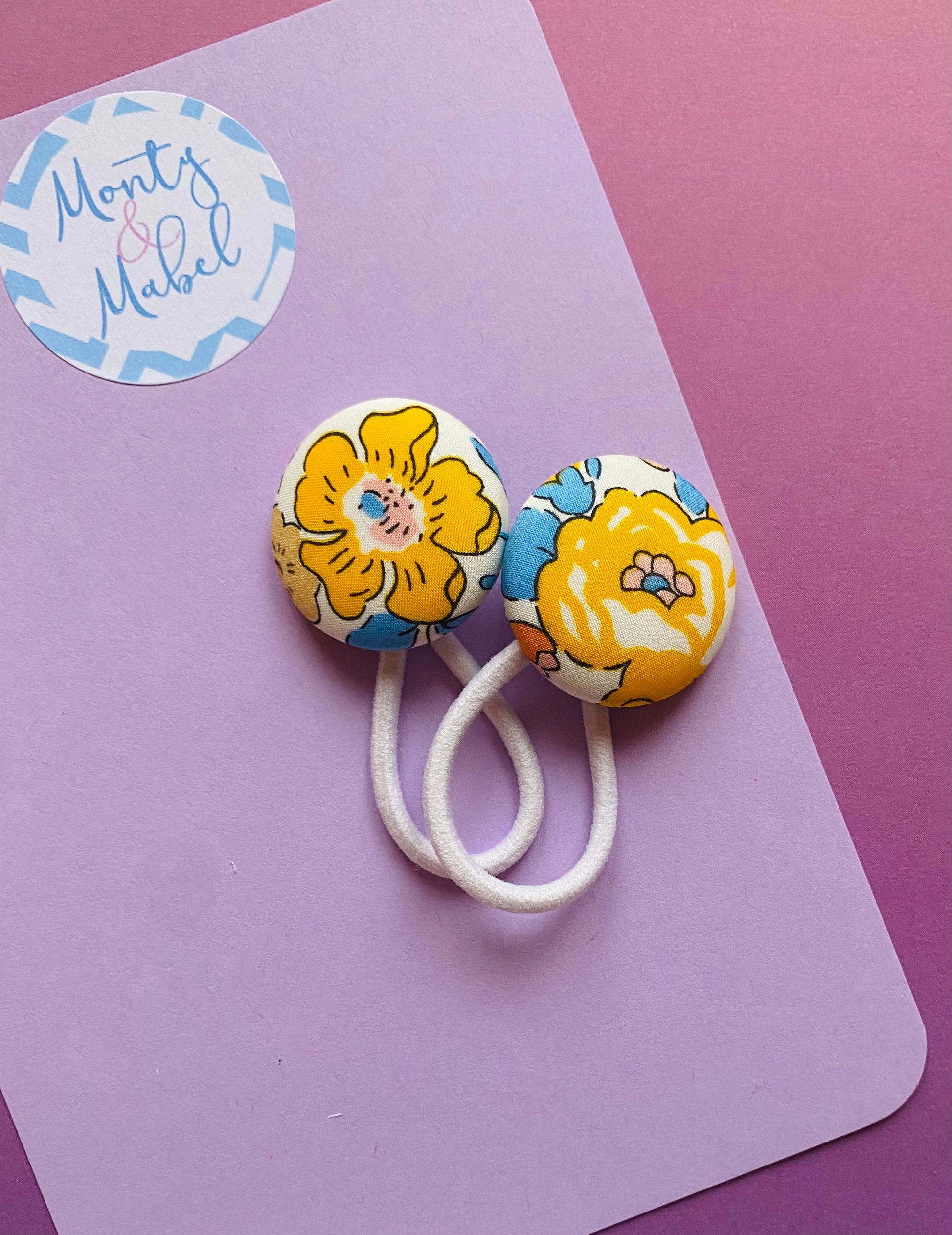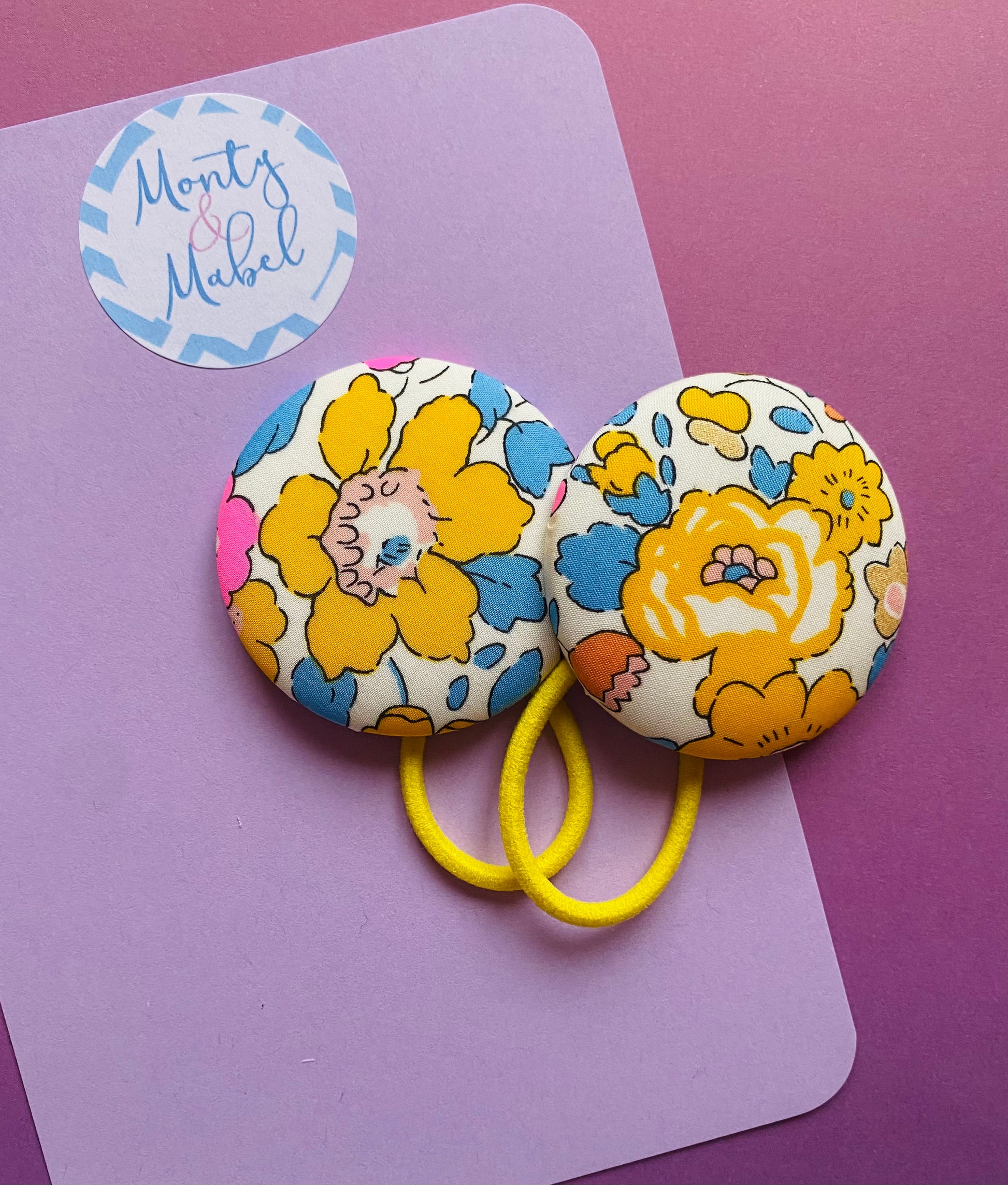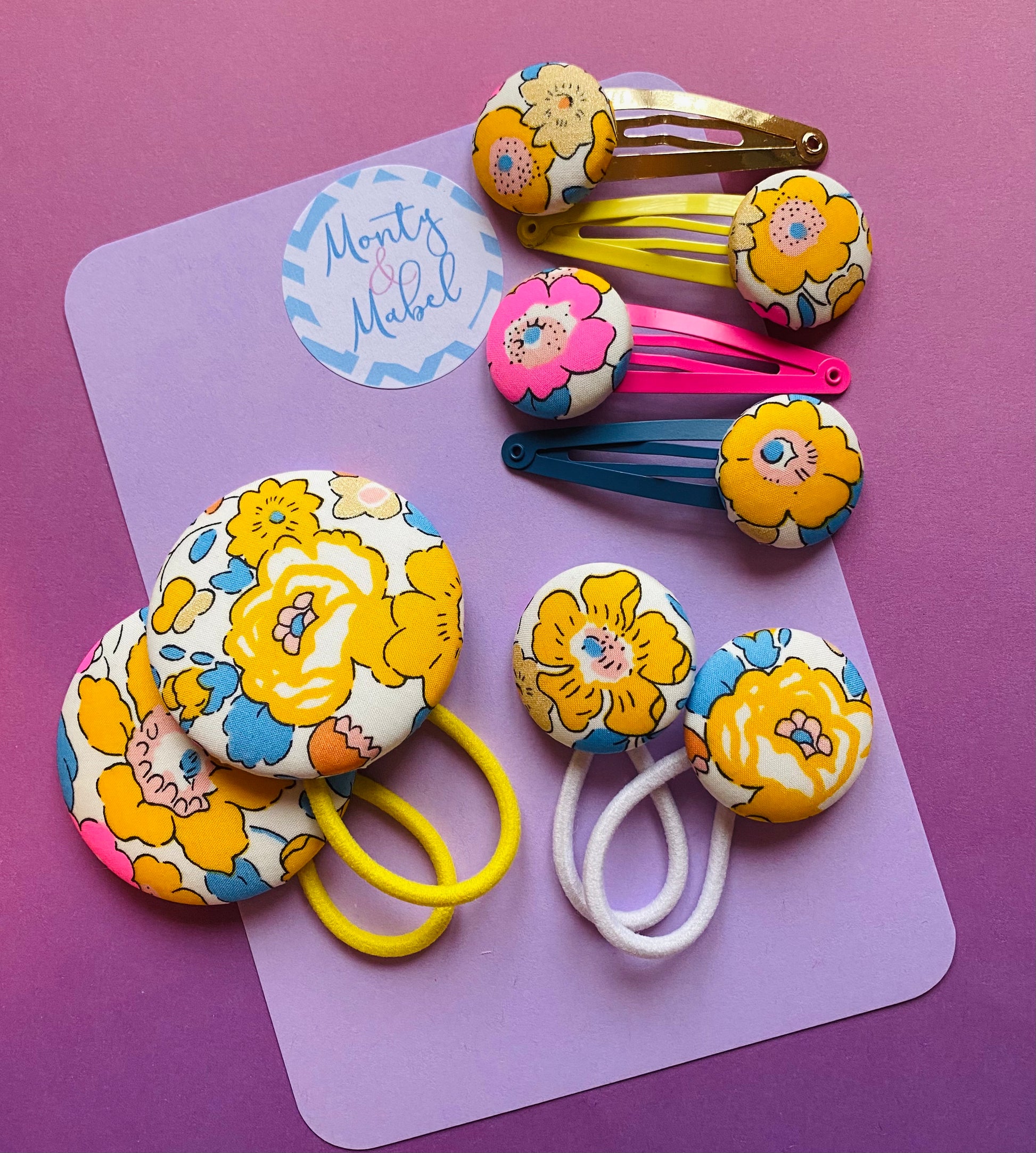 A twist on the classic Liberty Betsy floral with very bright yellow and pink and glitter gold, it works well in Large Bobbles, Small Bobbles, Standard & Tiny Clips, and all Bow sizes including the Diddy Bow Fringe Clips.