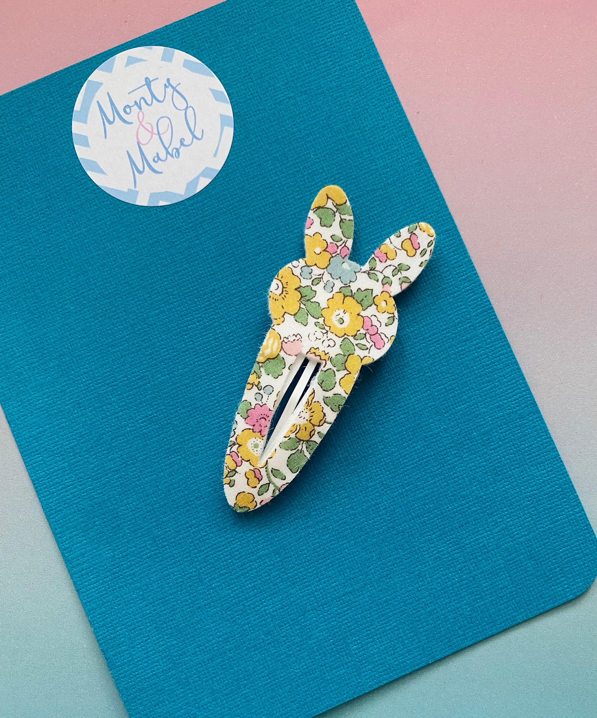 On a 5cm snap clip, lined with co-ordinating felt. Bunny size 3x7cm.