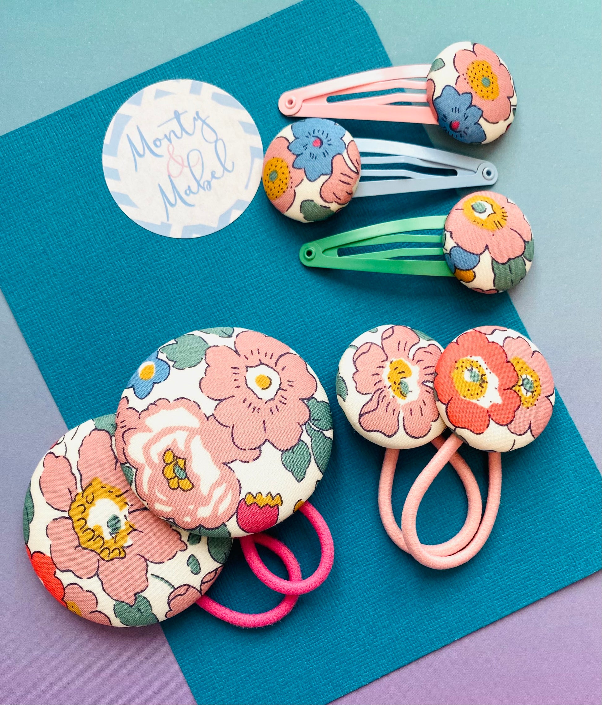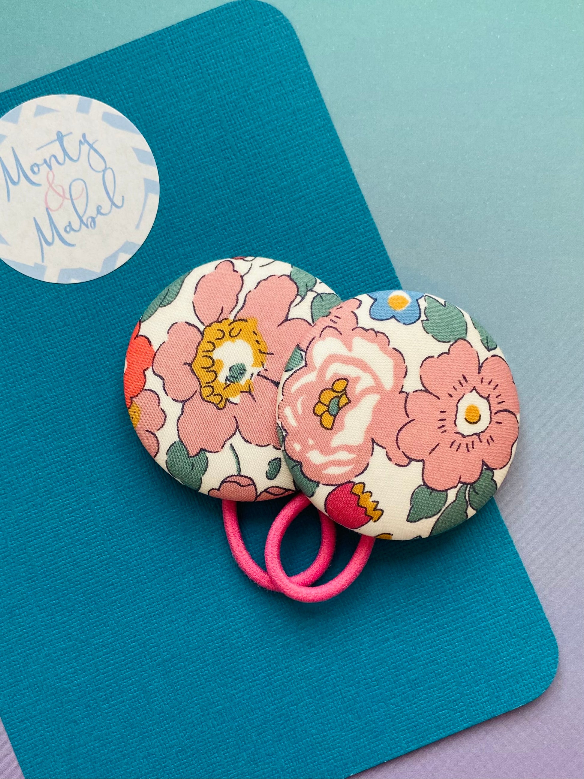 A classic Liberty Betsy floral with dusky pink and green, it works well in Large Bobbles, Small Bobbles, Standard & Tiny Clips, and all Bow sizes including the Diddy Bow Fringe Clips.
