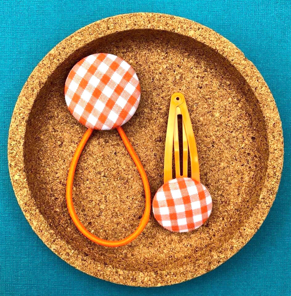 Orange gingham perfect for school, it works well in Large Bobbles, Small Bobbles, Standard & Tiny Clips, and all Bow sizes including the Diddy Bow Fringe Clips.