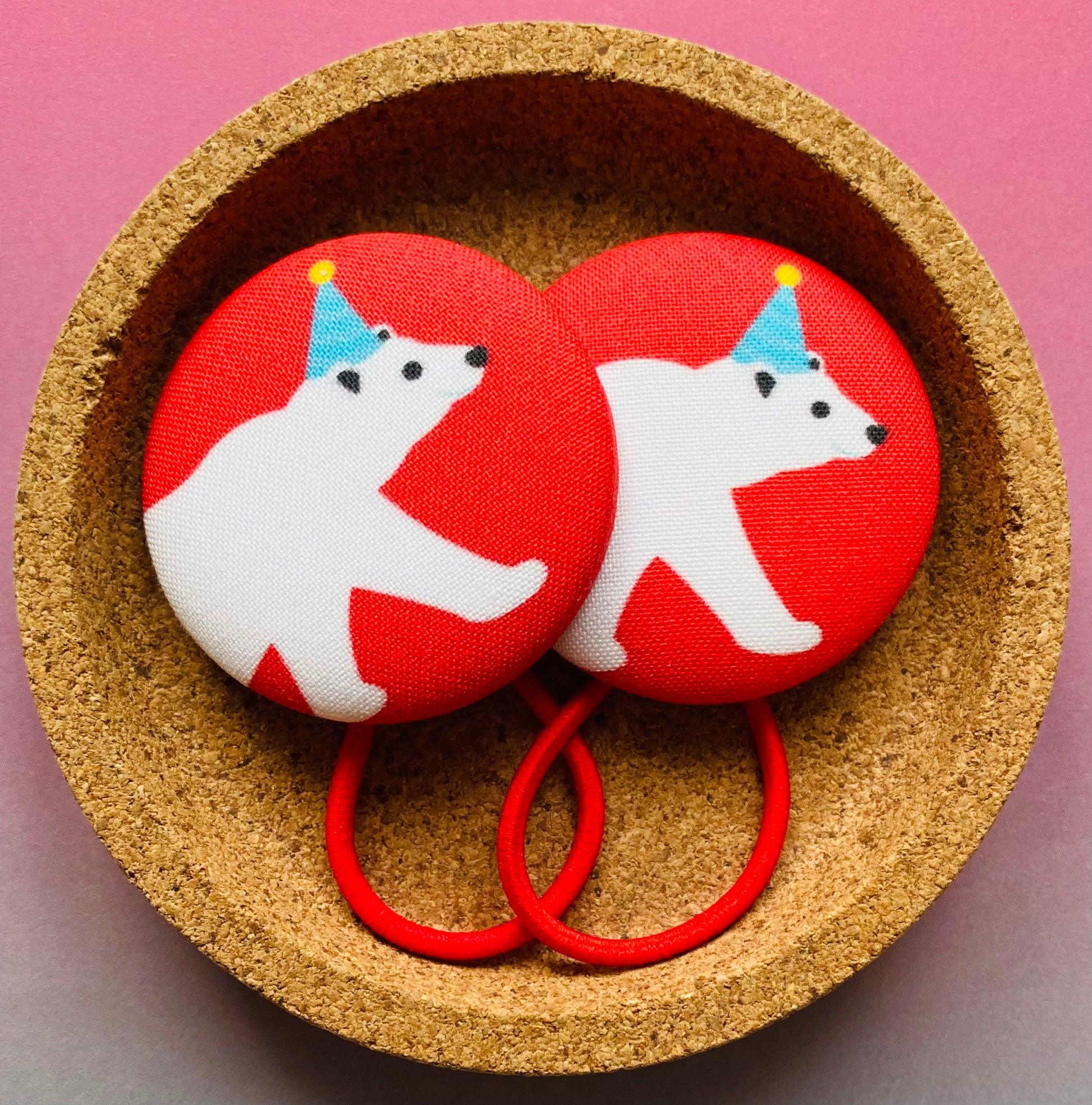 Fun little polar bear wearing a party hat, on a red background.