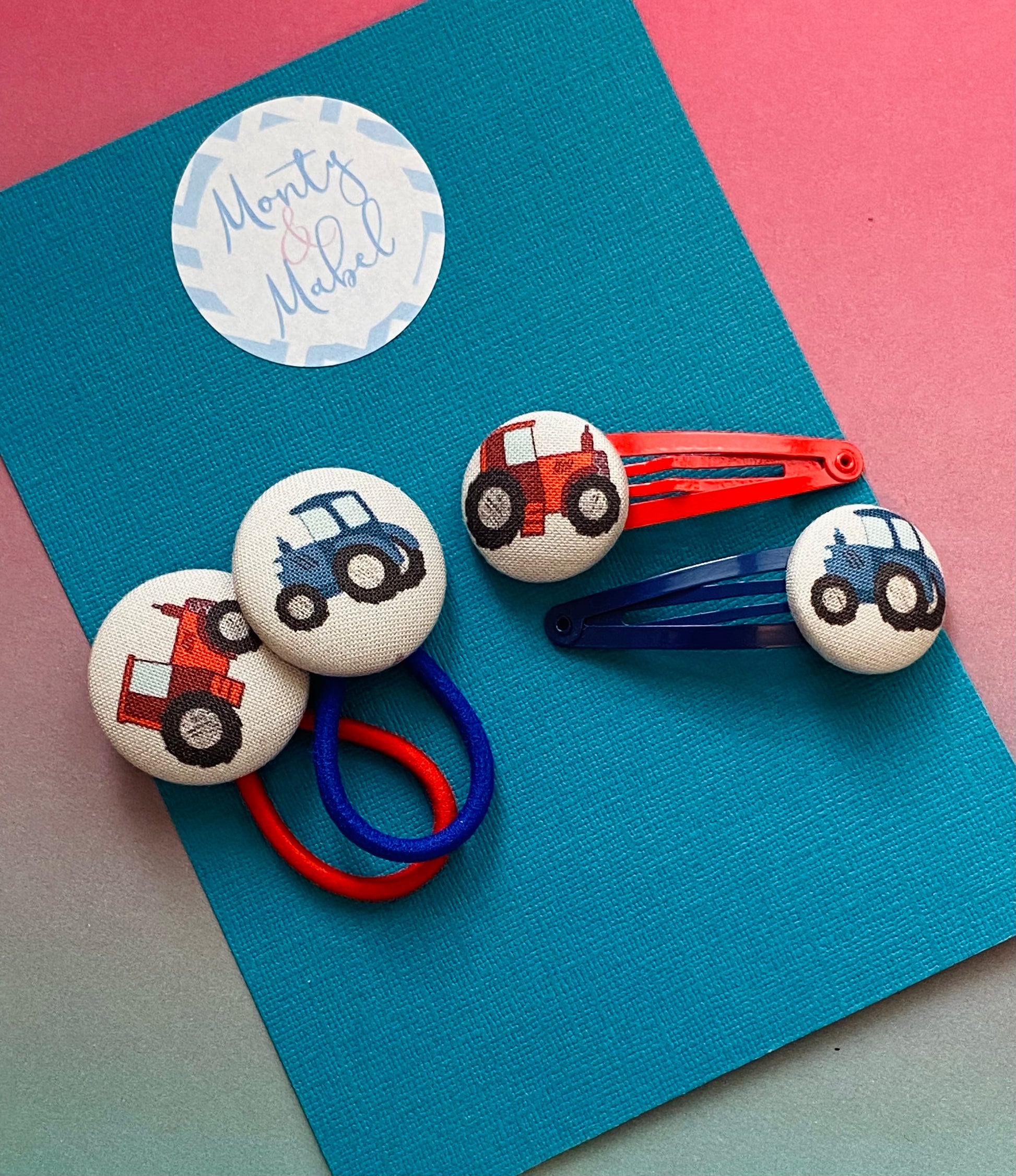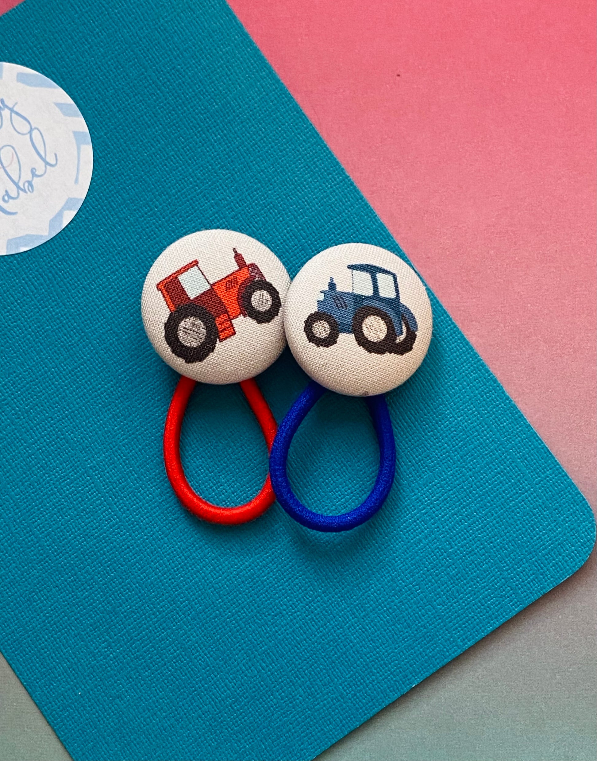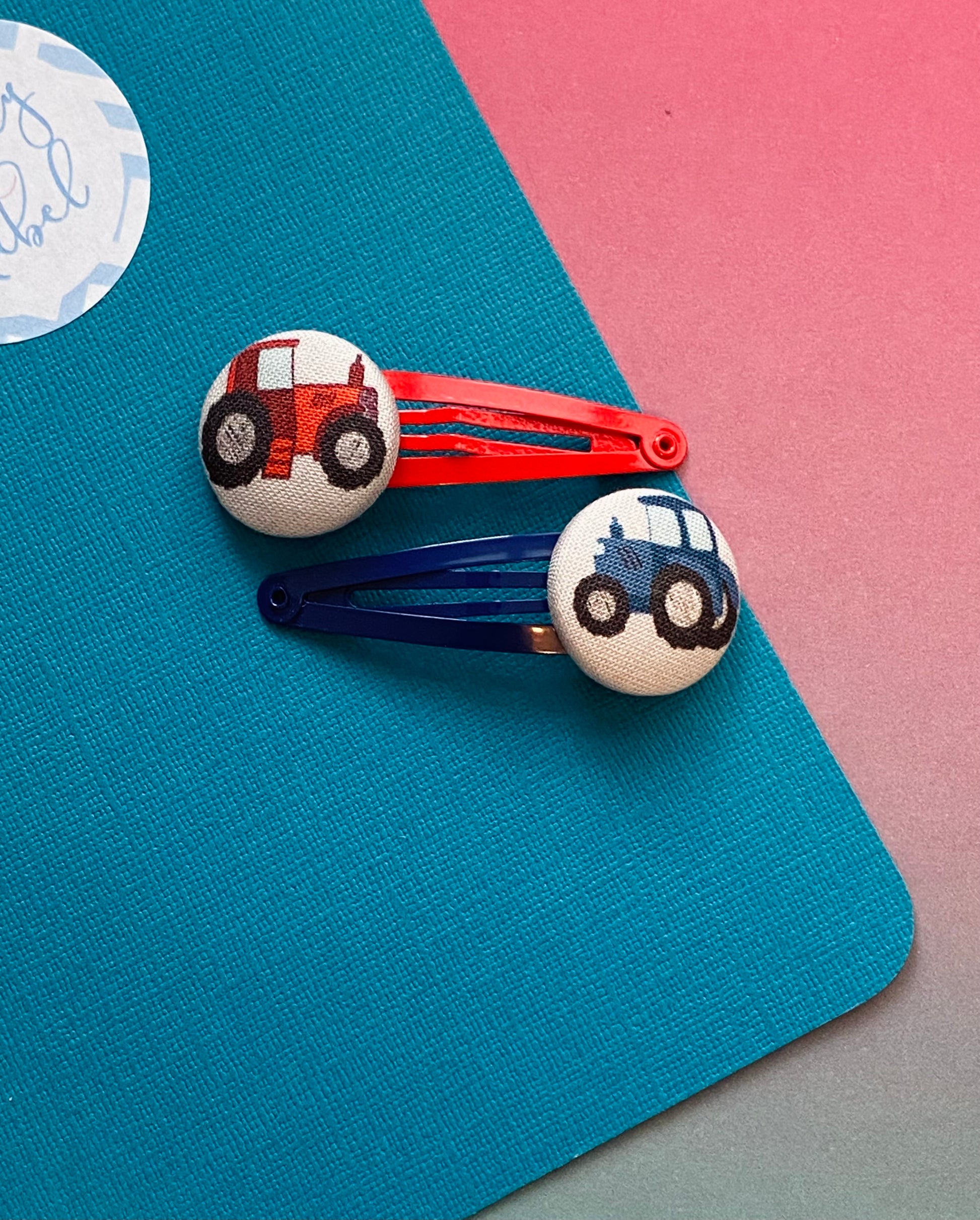 Red & blue tractors on a light background. They work well in Small & Tiny Bobbles, and Standard clips.